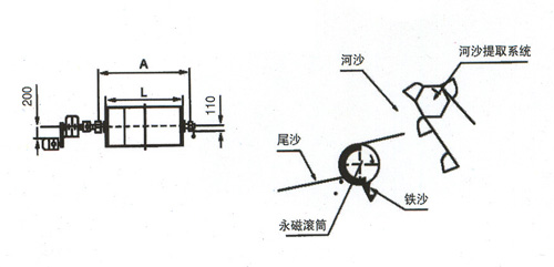 從河床提取的河沙加水后,進入格篩,篩去粗大石塊后,進入帶有勻礦板的槽體,再次經加水稀釋、漂洗的沙漿均勻的給到滾筒表面具有高磁力的選別區(qū)。其中較高品位的鐵沙被高磁力吸附于筒體表面,并被旋轉的筒體輸送到下部的洗沙區(qū),經沖洗水沖掉附帶的沙后被輸送到礦區(qū),由水流沖的鐵沙收集槽,成為高品位的鐵沙。而其中非槽性泥沙,則不受磁力作用直接進入尾槽排出。由此達到提取鐵粉的目的。